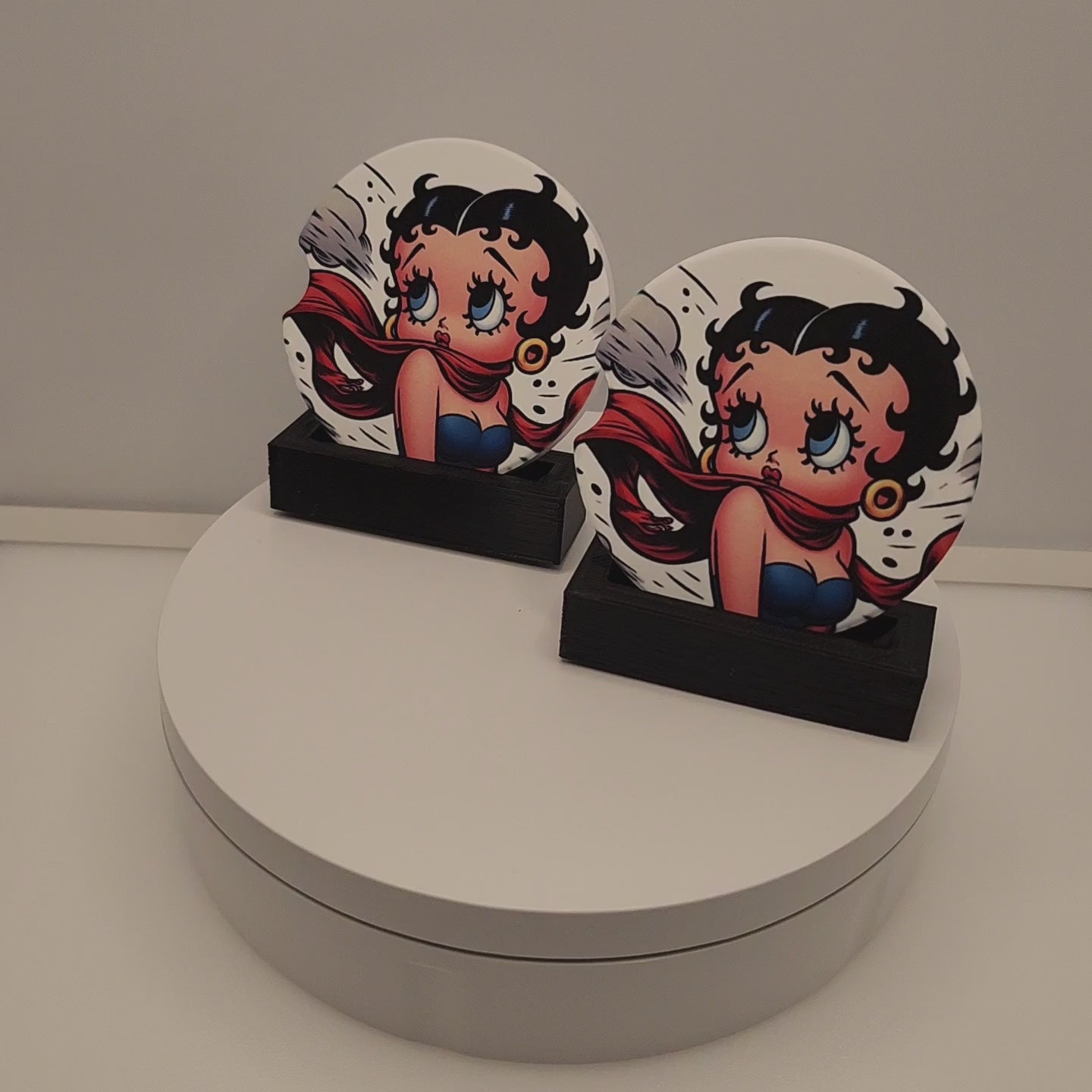 Elevate your car's interior with these adorable Betty Sandstone Car Coasters. The image of Betty with her scarf blowing in the wind will add a touch of nostalgia to your daily commute. Keep your cup holders clean and show off your love for the iconic character with these fun coasters. * Coasters are ceramic with a Matte finish.